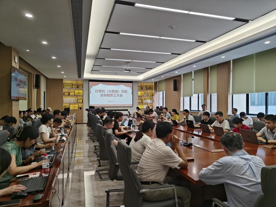 7月6日下午,计算机(大数据)学院在博思楼A6 S205召开全体教职工大会,全面总结2025年上半年工作成果,部署暑期及下半年重点工作。学院副院长(主持工作)戴平主持会议并作学院年中盘点报告,全体教职工参会。(图为大会现场)会议伊始,各教研室主任依次汇报了上半年工作目标完成情况,重点分析了工作中遇到的困难和存在的问题。戴平随后作学院年中工作总结报告,系统梳理了学院年度工作目标的整体进展。接着,各业务分管中层对近期重点工作及暑假工作安排予以汇报。(图为各业务团队汇报)戴平对学院上半年的工作成果给与了充分肯定,对暑期重点工作、硕士点建设、智慧教育3.0建议及队伍建设等重点工作作出布置。并号召全体教职工充分利用暑假时间做好个人提升,学院也将以学校硕士点建设为契机,为教师发展搭建更广阔的平台。(图为戴平发言)