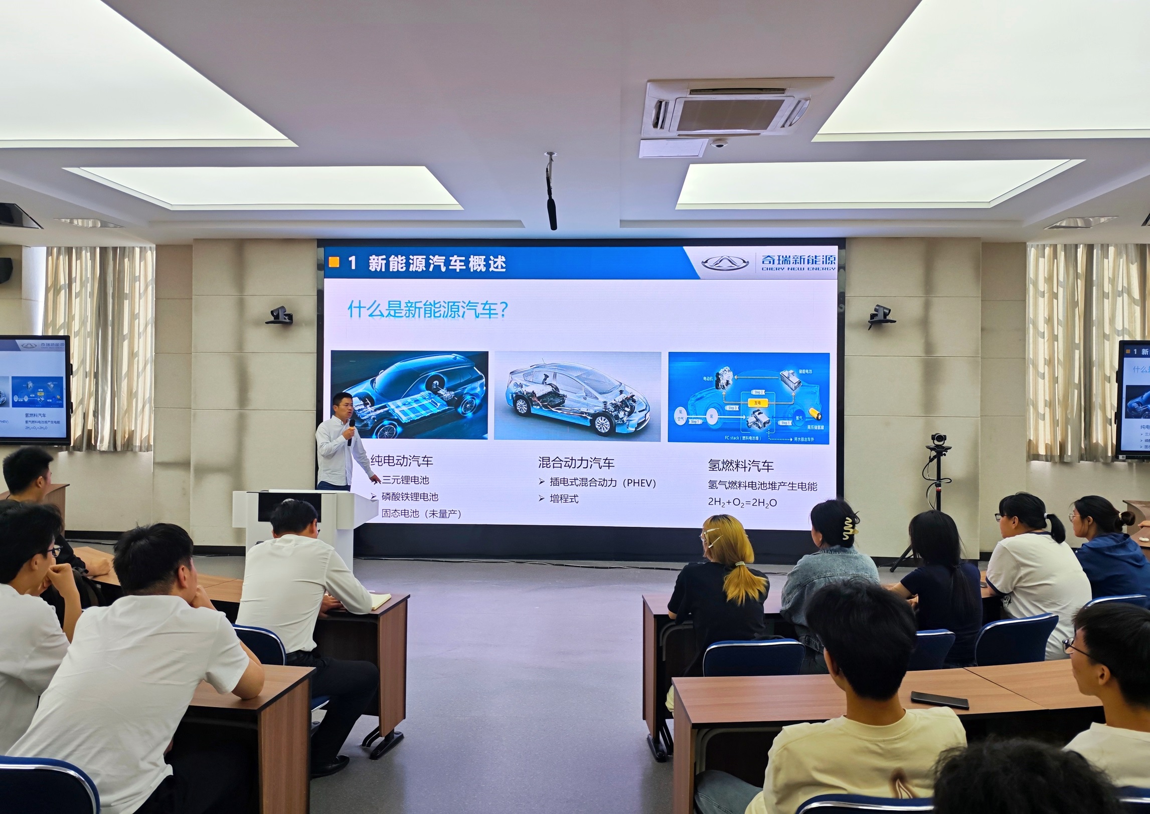本网讯 为帮助同学们加强专业基础,认识新能源汽车产业发展需求,5月13日下午,机械工程学院邀请了奇瑞新能源汽车股份有限公司经理、正高级工程师周俊锋,在博学楼W301报告厅为同学们主讲“铝框架车身电动车工艺规划及开发”。此次讲座同时为学院2024年“专业技能过关周”系列活动之一,近200名学生参加了此次讲座,讲座由院长助理苗思忠主持。(苗思忠主持讲座)(周俊锋讲座现场)讲座中,周俊锋从“什么是新能源汽车”开始讲起,结合企业真实案例,详细阐述了铝框架车身的优势,如减轻车身重量、提高能效、降低能耗等,并分享了国内外在铝框架车身电动车工艺规划及开发方面的最新进展。讲座最后,周俊锋结合自身工作经历,讲述了一名毕业生在奇瑞如何一步步成长蜕变的过程,嘱咐同学们学好专业知识,并强调了英语和高等数学的重要性。整场讲座内容充实、案例丰富,让同学们更加清楚的认识了专业课程的重要性,同时了解了新能源汽车产业发展需求,帮助同学们进一步明确了努力方向。